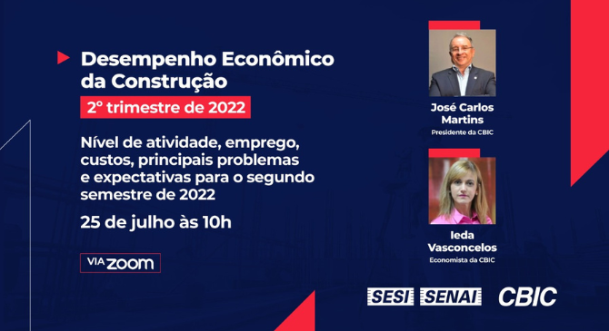 Na próxima segunda-feira, dia 25/7, às 10h, a Câmara Brasileira da Indústria da Construção (CBIC) vai apresentar o Desempenho Econômico da Indústria da Construção no 2º trimestre de 2022. As informações incluem nível de atividade do setor, emprego, custos, principais problemas e expectativas para o segundo semestre.