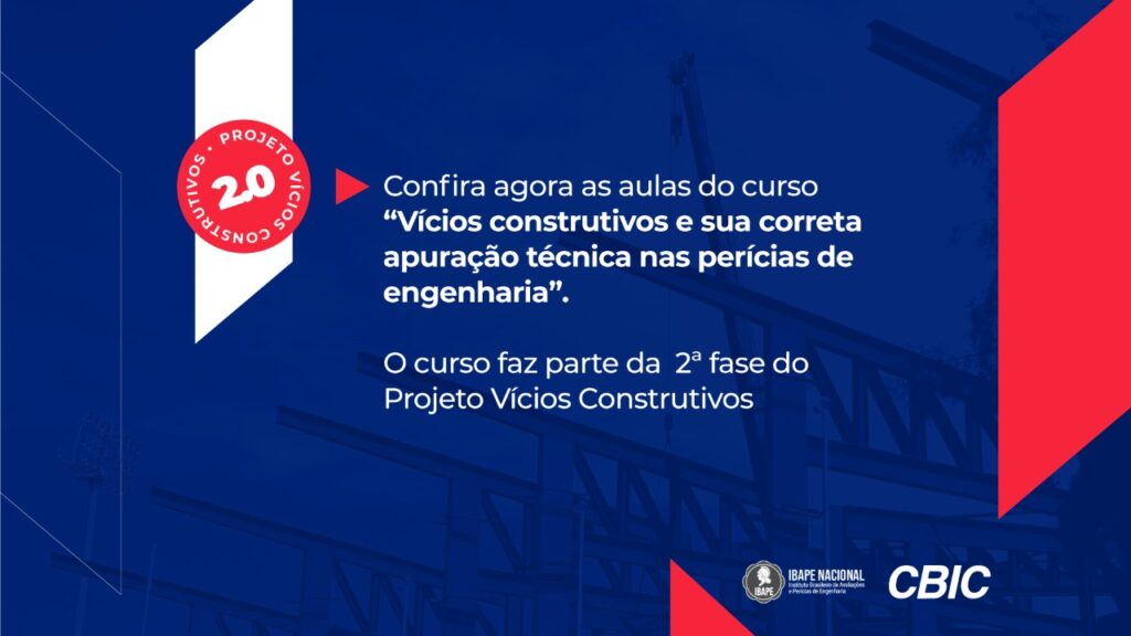 A Câmara Brasileira da Indústria da Construção (CBIC), por meio do seu Conselho Jurídico (Conjur), realizará a partir do próximo mês de agosto o curso Vícios construtivos e sua correta apuração técnica nas perícias de engenharia. A iniciativa integra a 2ª fase do Projeto Vícios Construtivos da entidade. Para que o público interessado conheça a proposta da iniciativa, a CBIC promoverá uma Master Class no próximo dia 27/7, às 19h, em seu canal oficial no YouTube.