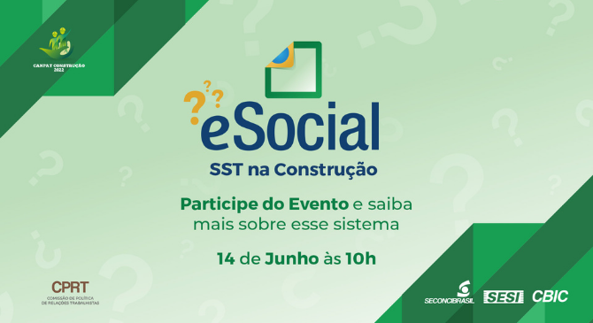 A Câmara Brasileira da Indústria da Construção (CBIC), em correalização com o Serviço Social da Indústria (SESI) e apoio do Seconci-Brasil, realizará no dia 14 de junho, às 10h, o evento virtual “eSocial – SST na Construção”. O evento é uma iniciativa da Comissão de Política de Relações Trabalhistas (CPRT/CBIC) e tem como objetivo abordar informações, realizar atualizações e esclarecimentos sobre o sistema eSocial, em especial voltado ao tema da Saúde e Segurança no Trabalho (SST).