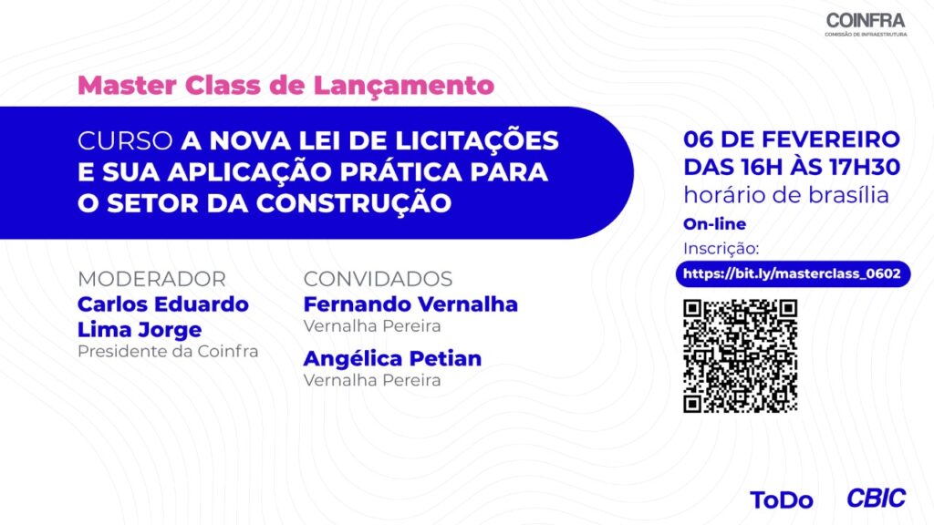 A Câmara Brasileira da Indústria da Construção realiza, no dia 06 de fevereiro, a Master Class do lançamento do curso “A Nova Lei de Licitações e sua Aplicação Prática para o Setor da Construção”. O evento é gratuito e será realizado online, com transmissão ao vivo pelo YouTube da CBIC, das 16h às 17h30, horário de Brasília.