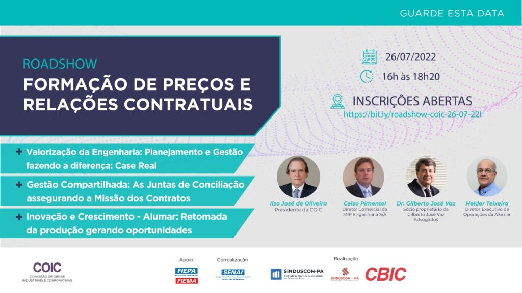 A Comissão de Obras Industriais e Corporativas (COIC), da Câmara Brasileira da Indústria da Construção (CBIC), promoverá no próximo dia 26 de julho, a partir das 16h, o primeiro Roadshow: formação de preços e relações contratuais de 2022.