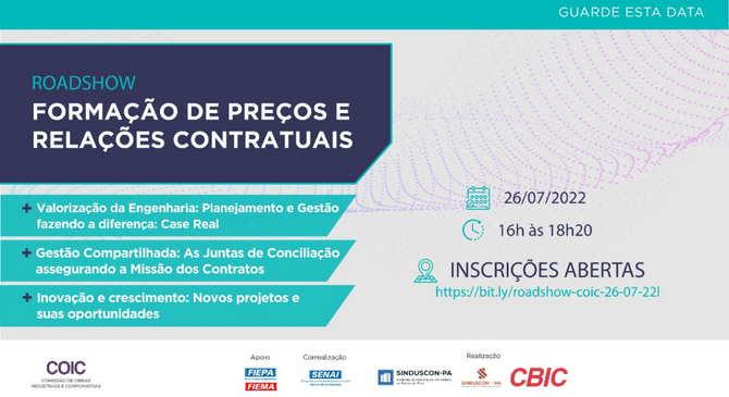 Valorização da engenharia, gestão compartilhada, inovação, produtividade e competitividade são algumas das bandeiras da Comissão de Obras Industriais e Corporativas (COIC), da Câmara Brasileira da Indústria da Construção (CBIC). Pensando nisso, a COIC promove, no próximo dia 26 de julho, a partir das 16h, o Roadshow: formação de preços e relações contratuais. O encontro abordará cases sobre planejamento e gestão de empresas que tenham seus projetos desenvolvidos nos estados do Pará e Maranhão, além do tema “As Juntas de Conciliação assegurando a Missão dos Contratos”.