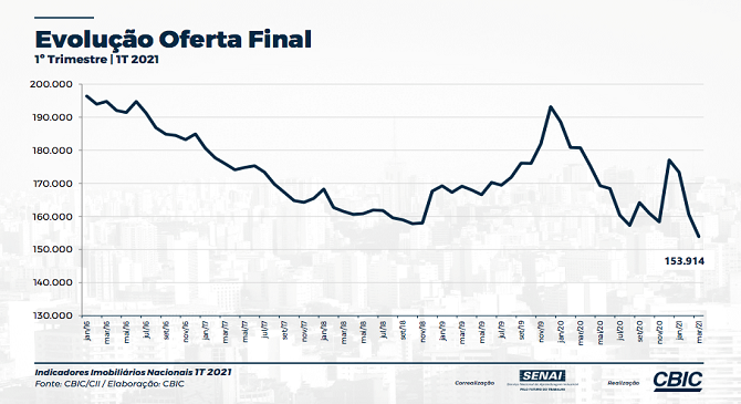 A oferta final de imóveis no 1º trimestre de 2021, na comparação com o mesmo período de 2020, apresentou uma queda de 14,8%. Na comparação com o 4º trimestre de 2020, a oferta final caiu 13,1% nos três primeiros meses deste ano.