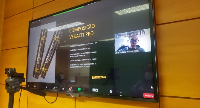 Abrindo a rodada de palestras, o gerente técnico comercial da Vedacit, Rolando Infanti Filho, apresentou o trabalho institucional da empresa e a tecnologia de mantas asfálticas ‘Vedacit Pro’, passando por questões como a composição e as qualificações.