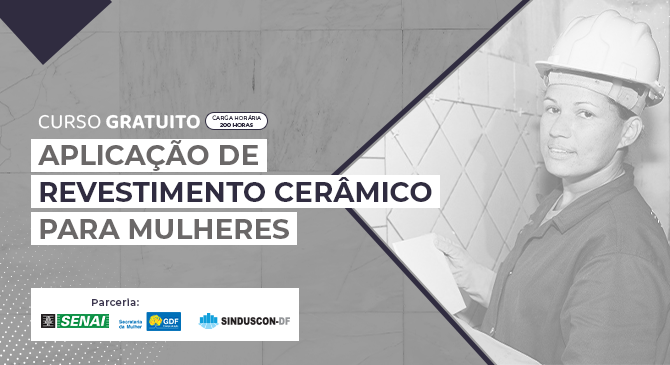 O Sinduscon-DF, em parceria com o Senai-DF e a Secretaria da Mulher do DF, promove o curso de “Aplicação de Revestimento Cerâmico”. Será em formato presencial, com aulas de segunda a sexta, das 14h às 18h, no Senai (Área Especial nº 2, Setor “C” Norte – Taguatinga Norte). O treinamento começa no dia 16 de maio e segue até o dia 09 de agosto, com carga horária de 200 horas.
