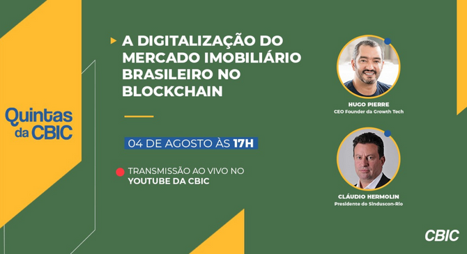 Quintas da CBIC desta semana vai tratar sobre “A digitalização do mercado imobiliário brasileiro no Blockchain”. O CEO Founder da Growth Tech, Hugo Pierre, e o presidente do Sinduscon-Rio, Cláudio Hermolin, serão os participantes desta edição.