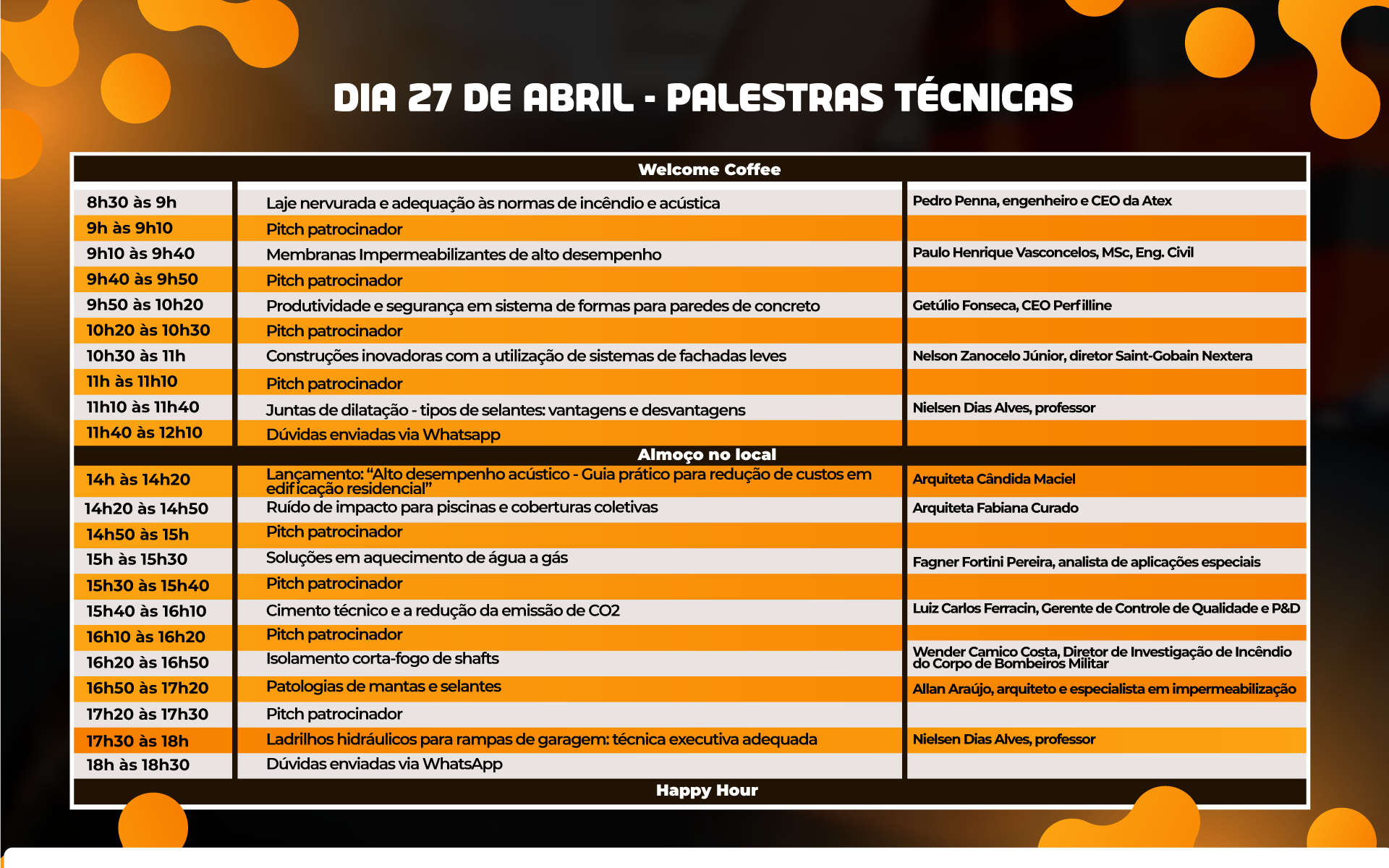 Serão dois dias de evento, sendo o primeiro deles, 27/04, com programação de palestras técnicas e o outro, 28/04, voltado para visitas técnicas para conhecer inovações nos canteiros de obras.