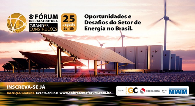 A Sobratema promoverá na quinta-feira (25) o 8º Fórum de Infraestrutura Grandes Construções. O evento terá como tema central: Oportunidades e Desafios do Setor de Energia no Brasil.