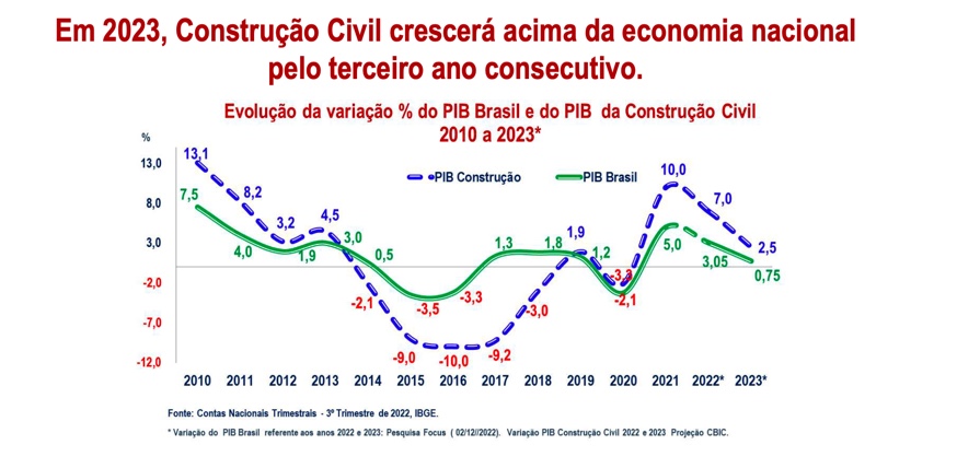A indústria da construção prevê um crescimento de 2,5% em 2023, em um ritmo de três anos consecutivos de expansão acima da economia nacional. A projeção considera a evolução consistente dos últimos dois anos, o ciclo de negócios do mercado imobiliário em andamento e a demanda habitacional sólida. A expectativa do setor para o próximo ano é positiva, segundo afirmou o presidente da Câmara Brasileira da Indústria da Construção (CBIC), José Carlos Martins.