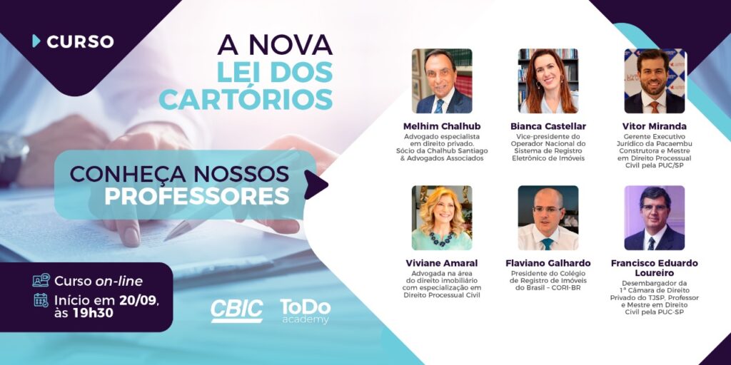 A Câmara Brasileira da Indústria da Construção (CBIC) realiza a partir do próximo dia 20/09, às 19h30, o EAD “A Nova Lei dos Cartórios”. O curso online e ao vivo será realizado nos dias 20, 21, 22, 27, 28 e 29/09, das 19h30 às 21h30 (Horário de Brasília).