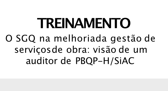 Com o objetivo de compartilhar conhecimentos e experiências para melhoria da eficiência técnica e econômica das empresas construtoras, o treinamento “Melhoria da Gestão de Serviços de Obra: visão de um auditor de PBQP-H /SiAC” é voltado para profissionais envolvidos no comando do sistema de gestão da qualidade da empresa construtora.