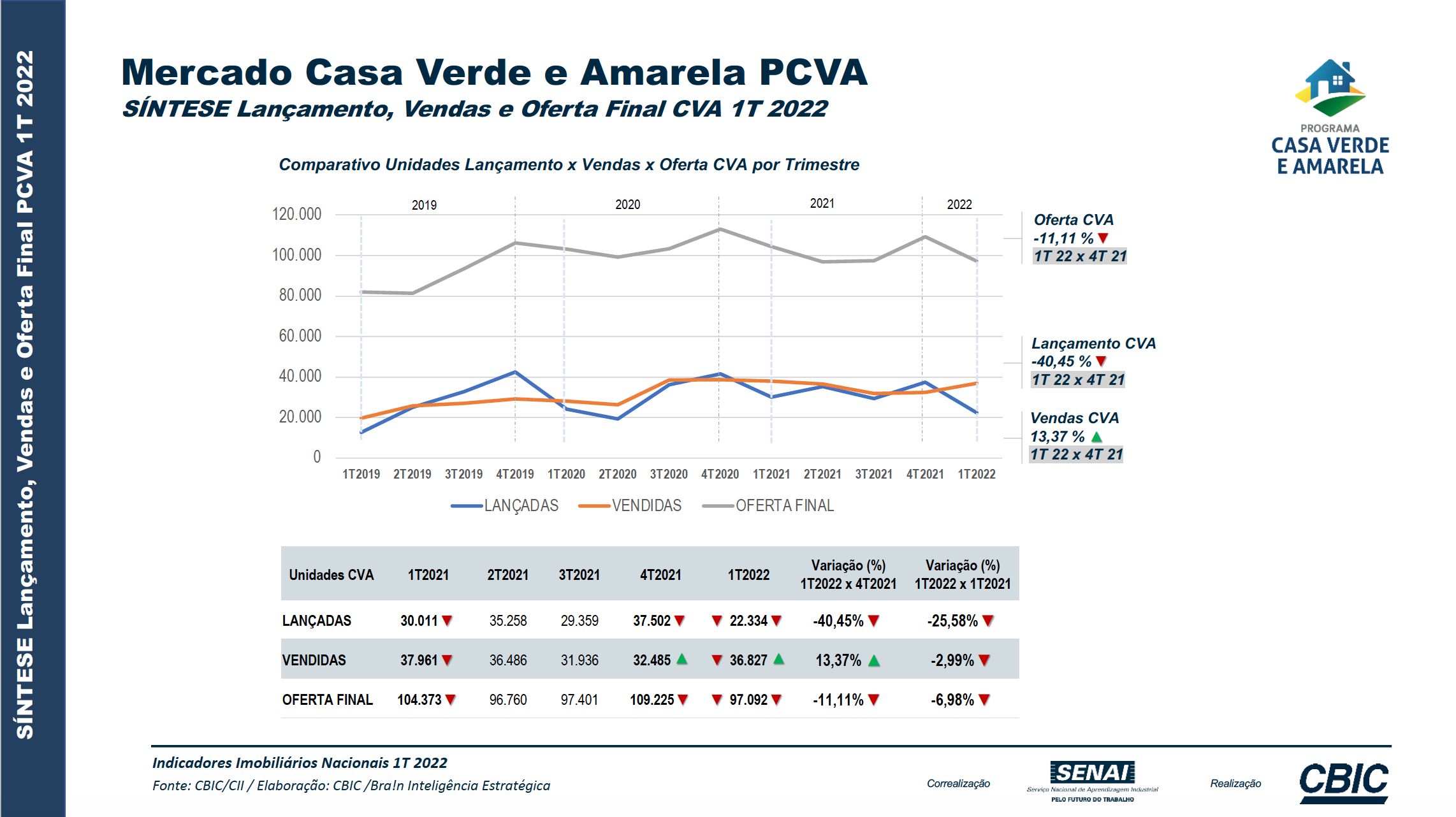 No 1º trimestre de 2022, os lançamentos de unidades do programa habitacional Casa Verde e Amarela (CVA) foram reduzidos em 40,4% e a oferta final em 11,1%, em comparação com o 4º trimestre de 2021. Os números negativos não têm relação com a alta nas taxas de juros, mas são afetados por três fatores predominantes: aumento dos preços e dos custos dos materiais da construção civil; falta de confiança para novos lançamentos dos empresários e incorporadoras; e queda do poder aquisitivo das famílias.
