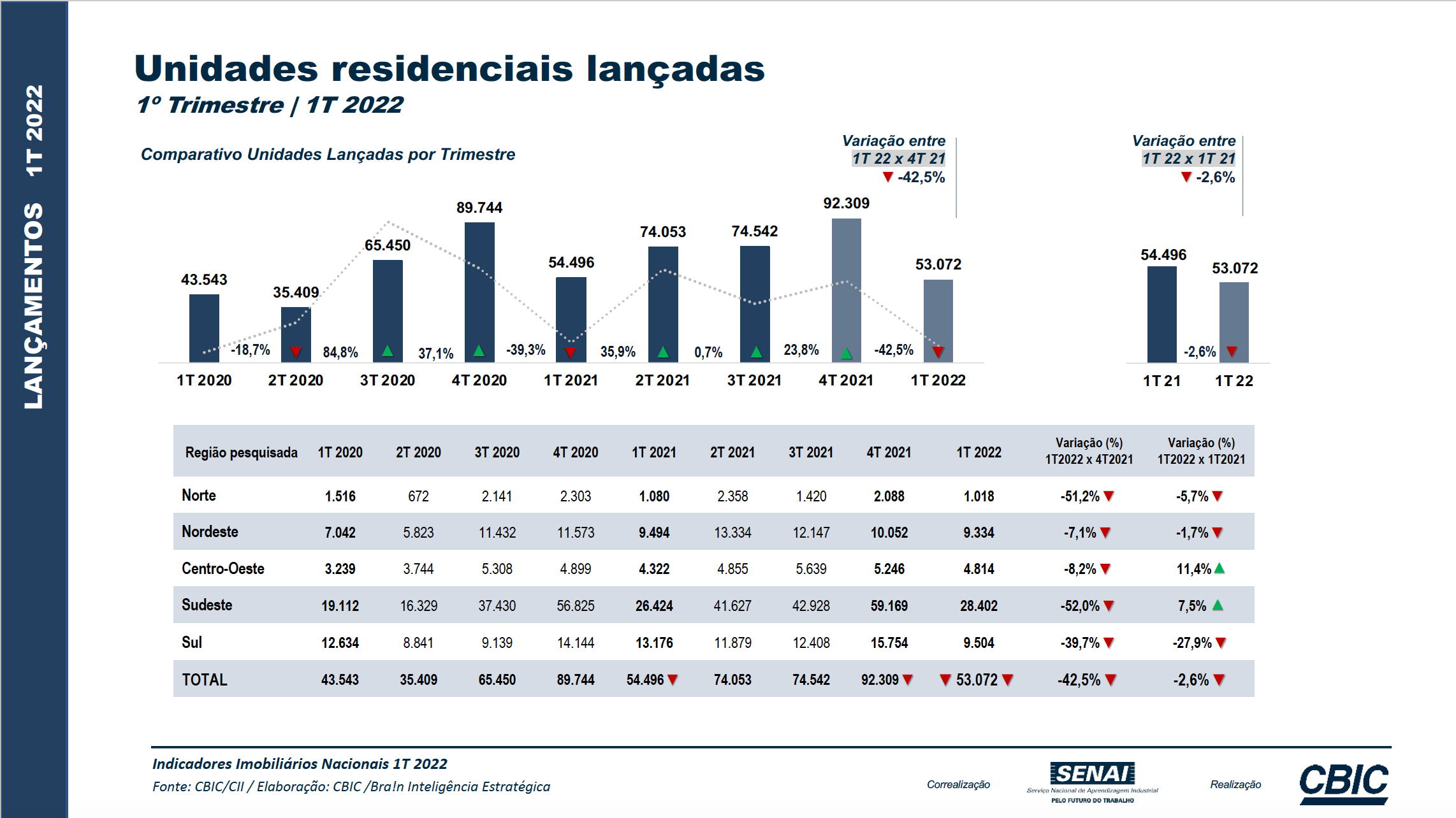 Em relação ao 4º trimestre de 2021, o Sudeste foi a região que mais registrou queda nos lançamentos com 52%, seguida da Região Norte (51,2%), Sul (39,7%), Centro-oeste (8,2%) e Nordeste (7,1%). Já em comparação com o 1º trimestre de 2021, as regiões Centro-oeste e Sudeste registram alta de 11,4% e 7,5%, respectivamente. As demais apresentaram queda: Sul (27,9%), Norte (5,7%) e Nordeste (1,7%).