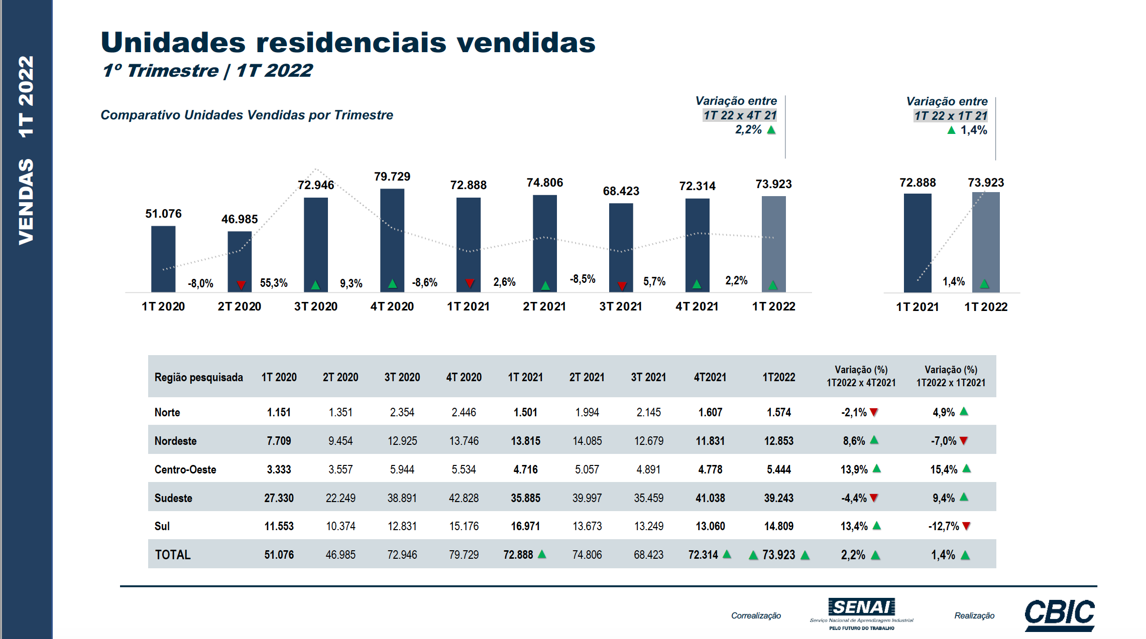Sobre as vendas, existiu uma tendência de crescimento desde o 1º trimestre de 2017, mas a partir do 2º semestre de 2021, começaram a estabilizar. Em relação ao 4º trimestre de 2021, o número de unidades residenciais vendidas subiu 2,2%.