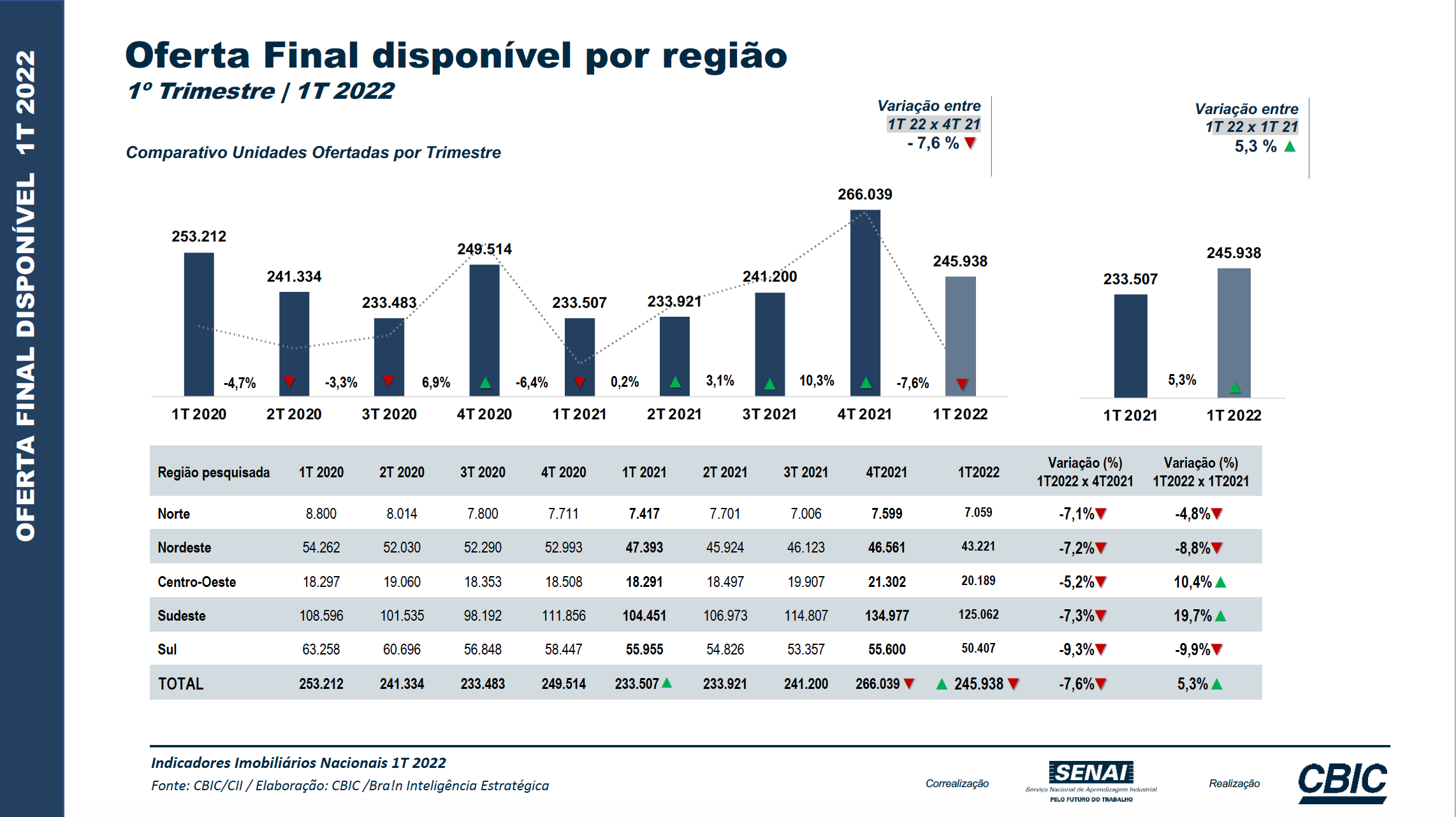 O mercado imobiliário, como um todo, demonstrou queda no período, especialmente no número de lançamentos e da oferta final – como consequência do aumento do preço dos insumos e da conjuntura econômica. No 1º trimestre de 2022, em comparação com o trimestre anterior, os lançamentos foram reduzidos em 42,5% e a oferta final em 7,6%.