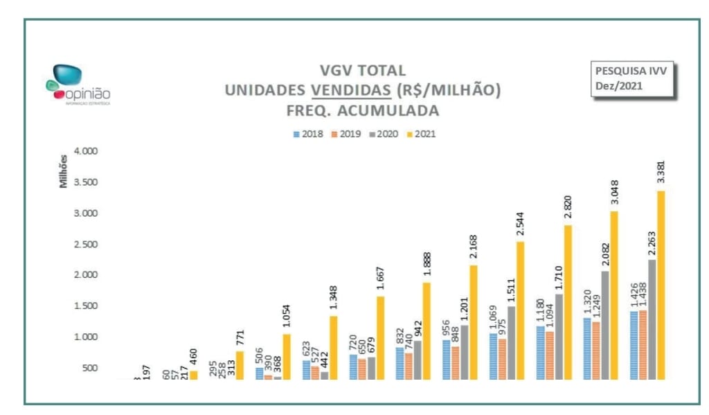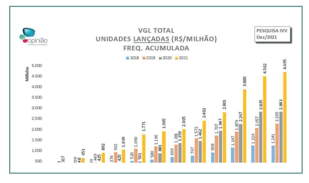 Mais um ano com recorde em vendas e lançamentos no Distrito Federal: em 2021, a combinação das taxas de juros baixas aos efeitos da pandemia de Covid-19 levaram o mercado imobiliário a superar o desempenho de 2020. Dados da pesquisa Índice de Velocidade de Vendas (IVV) mostram que os resultados do setor foram positivos como no período anterior à crise econômica iniciada em 2015: entre janeiro e dezembro do ano passado foram acumulados 43 lançamentos e a oferta de 5.074 imóveis residenciais no DF. Impulsionados pela confiança do comprador e a alta demanda por moradia, foram registrados Valor Geral de Lançamentos (VGL) de R$ 4,6 bilhões e Valor Geral de Vendas (VGV) de R$ 3,3 bilhões.