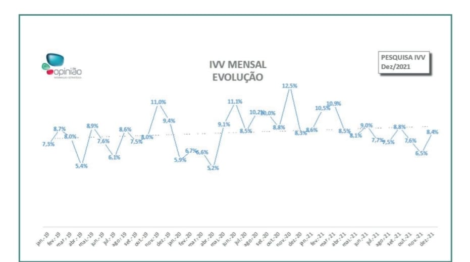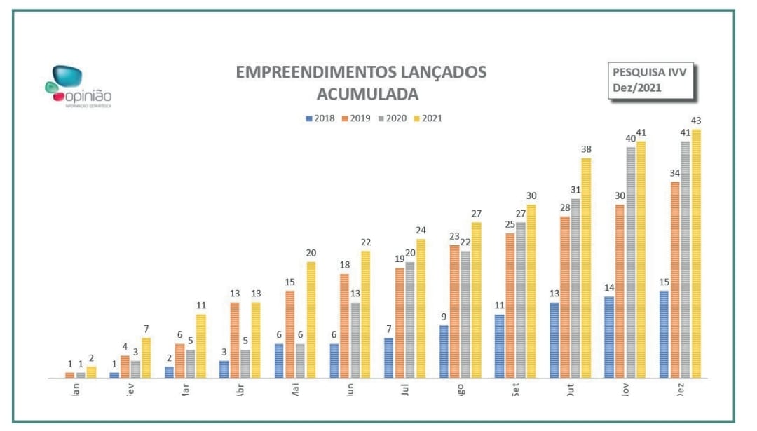 Em dezembro de 2021 foi registrado IVV de 8,4%, indicador superior ao realizado no mês de novembro, de 6,5%. No último mês do ano foram lançadas 401 unidades novas e comercializados 427 imóveis. Comparada a 2020, a oferta total de imóveis residenciais captada pela pesquisa cresceu 48,8%: de 3.409 unidades, o estoque alcan çou 5.074 unidades. “Esta é a primeira vez que registramos oferta de imóveis acima de cinco mil unidades desde 2015”, comenta Eduardo Aroeira.