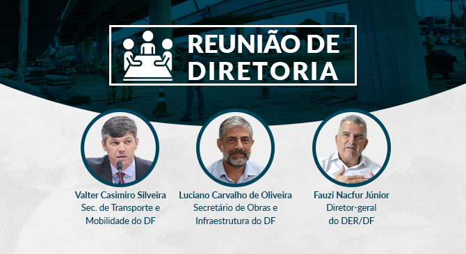 A reunião de terça-feira, 10 de maio, às 10h, vai receber o secretário de transporte e mobilidade do DF, Valter Casimiro Silveira; o secretário de obras e infraestrutura do DF, Luciano Carvalho; e o diretor-geral do Departamento de Estradas de Rodagem do DF (DER/DF), Fauzi Nacfur Junior.