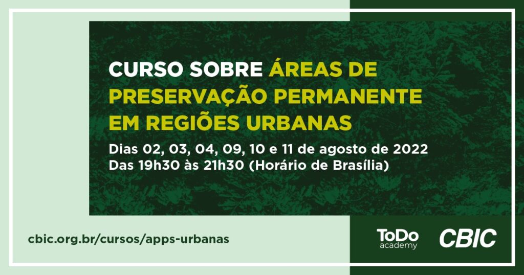 O curso sobre Áreas de Preservação Permanente (APPs) em Regiões Urbanas, promovido pela Câmara Brasileira da Indústria da Construção (CBIC), tem novas datas e conteúdo expandido. A especialização acontecerá no mês de agosto, nos dias 02, 03, 04, 09, 10 e 11, das 19h30 às 21h30.