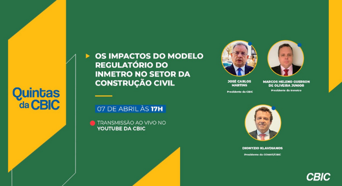 O Quintas da CBIC desta semana (7/4) vai tratar dos impactos do modelo regulatório do Inmetro no setor da construção civil, que foi aprovado em março deste ano e publicado no Diário Oficial da União. A implementação do modelo será gradual e se dará em cinco anos. O encontro será nesta quinta-feira, às 17h. Garanta sua vaga!
