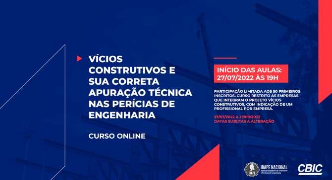 A Câmara Brasileira da Indústria da Construção (CBIC), em parceria com o Instituto Brasileiro de Avaliações e Perícias de Engenharia (IBAPE), lançará um curso online sobre “Vícios construtivos e sua correta apuração técnica nas perícias de engenharia”. A iniciativa marca a nova fase do projeto Vícios Construtivos da entidade. O curso será gratuito e destinado apenas às empresas que já fazem parte do projeto. Os membros podem indicar um profissional por empresa. A participação é limitada aos 50 primeiros inscritos. Garanta a sua inscrição!