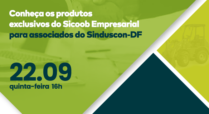 O Sindicato da Indústria da Construção Civil do Distrito Federal (Sinduscon-DF), em parceria com a Sicoob Empresarial e a Hanashiro Máquinas Agrícolas, realizará o evento “Conheça os produtos exclusivos do Sicoob Empresarial para associados do Sinduscon-DF”, na quinta-feira, 22 de setembro, a partir das 16h, no dia 22 de setembro, quinta-feira, às 16h, na sala Luiz Carlos Botelho Ferreira, localizado no SIA Trecho 2/3 Lote 1.125 – 2º andar.