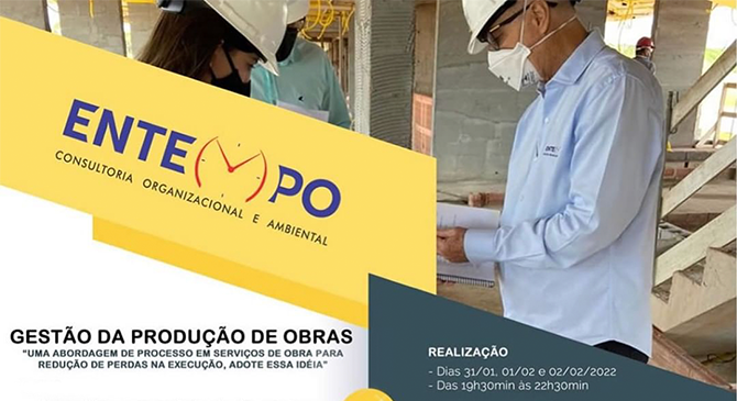 Estão abertas as inscrições para o curso “Gestão da produção de obras”, uma abordagem de processo em serviços de obra para redução de perdas na execução que será realizado nos dias 31/01, 01 e 02/02, das 19h30 às 22h30, no formato online, na plataforma Zoom.
