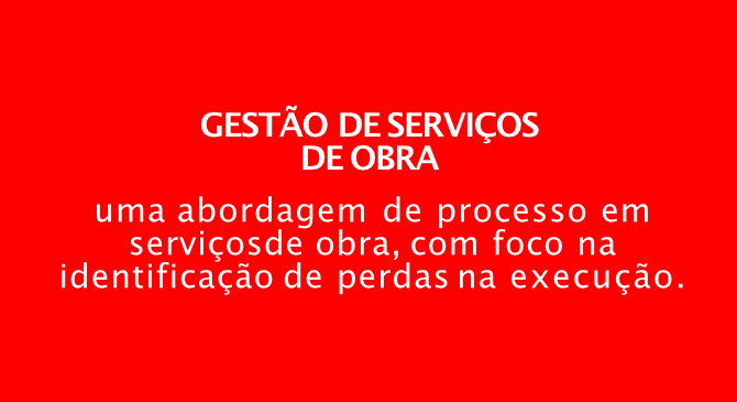 O treinamento gestão de serviços de obra é uma abordagem para identificação e redução de perdas na execução. O foco é a gestão da produção, visando uma excelência da operacionalização dos processos de serviços de obra para o alcance de melhores resultados organizacionais relativos a custo, prazo e qualidade.