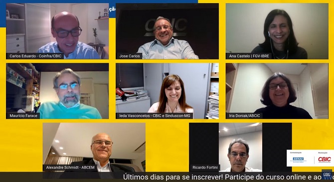 Participaram também do debate, Ieda Vasconcelos, economista da CBIC; Maurício Farace Corrêa, coordenador de projetos da FGV/IBRE; Ricardo Fortini, vice-presidente do Sindicato Nacional da Indústria da Construção Pesada (Sinicon); e Iria Doniak, presidente executiva da Associação Brasileira da Construção Industrializada de Concreto (ABCIC).