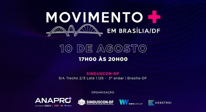 No dia 10 de agosto, quarta-feira, às 17h, ocorrerá workshop do Movimento +, uma parceria do Sinduscon-DF, Anapro+, Konstroi e VMV Group Brasil. Serão debatidos os mecanismos necessários para estruturar e impulsionar o negócio no cenário da construção e incorporação.